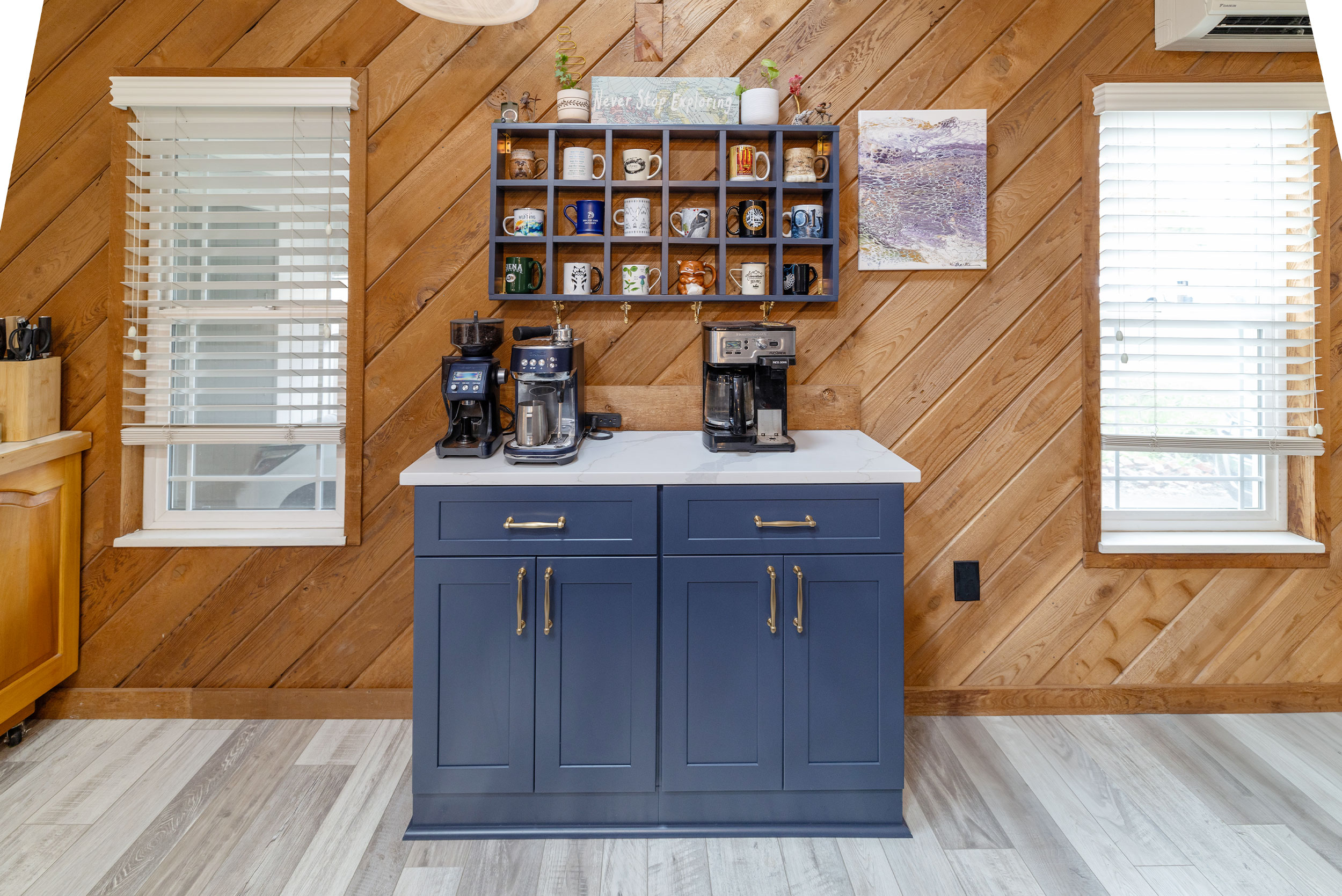 This design is rooted in the richness of materials—deep hues, warm metallics, and layered textures that create both drama and ease. The palette was thoughtfully chosen to blend seamlessly with the architecture and character of the home. The rich indigo cabinetry pairs beautifully with the natural cedar paneling found throughout the space, creating a cohesive, elevated look that honors the home’s original warmth and texture.